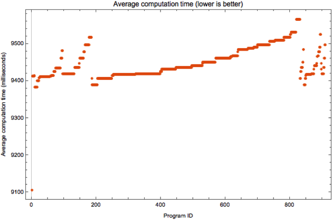 The process for equivalence testing used to resolve one of the experimental issues was inspired by Bansal and Aiken’s two-step equivalence test, where an initial execution test for “fingerprinting” is used to quickly scan the space of potential programs using a unit-testing methodology \[Bansal & Aiken 2006, p. 399\]. This process of testing the space of generated programs for equivalence in a synthetic environment and then using the physical system for detailed analysis greatly reduced the time to conduct experiments and did not reduce the quality of the results obtained, assuming Type 1 and Type 2 errors are sufficiently managed.